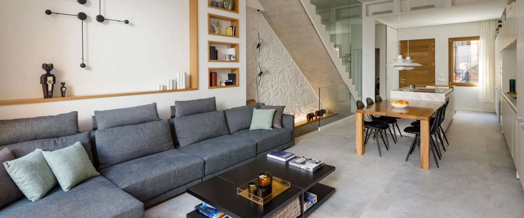 A l’interior, hem realitzat treballs de fusteria al bany, cuina, menjador i dormitoris, amb armaris encastats dissenyats a mida per optimitzar l’espai i aportar continuïtat als acabats. També hem intervingut a l’escala i l’estudi, buscant una integració harmònica de materials i funcionalitat.
