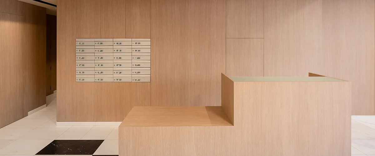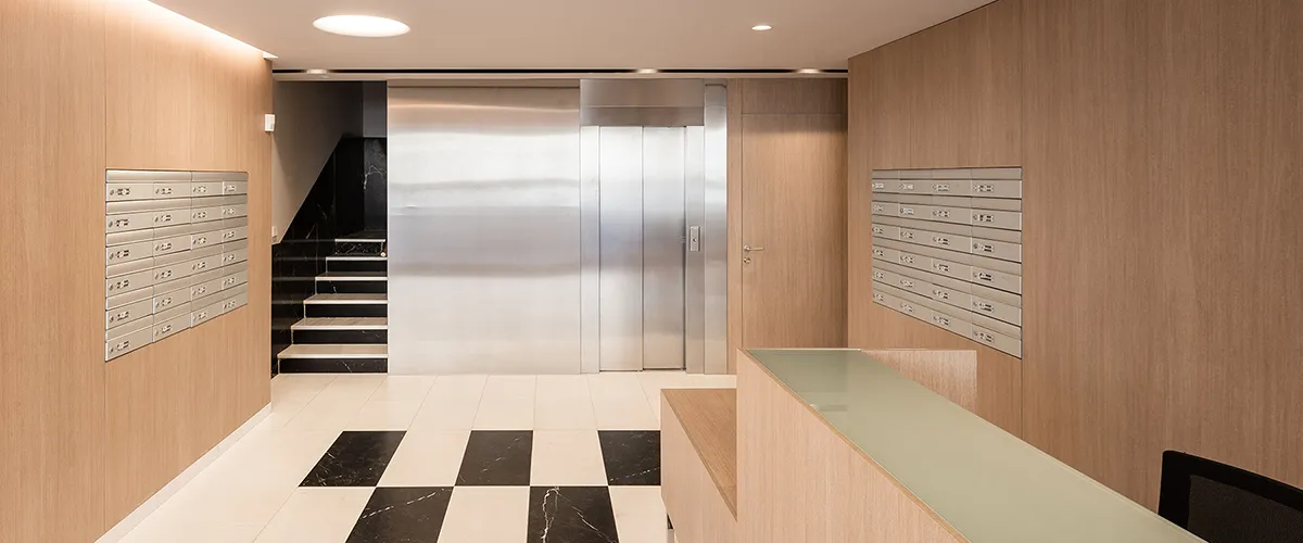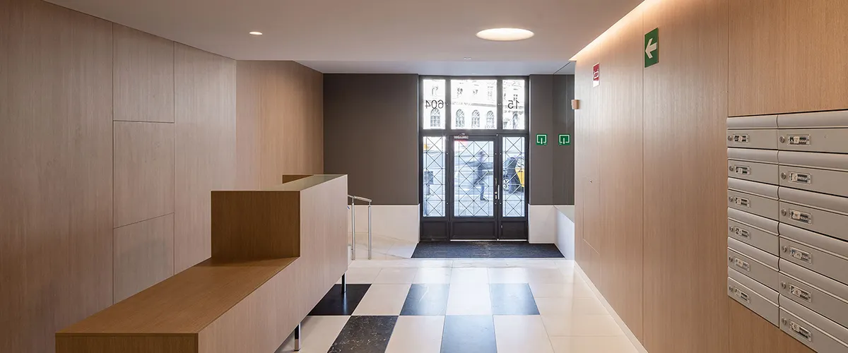 A l’entrada del bloc, s’han renovat les parets i revestiments, aportant una imatge renovada i elegant que dignifica l’accés a l’edifici. Aquesta zona s’ha concebut com un espai de transició acollidor, que reflecteix el caràcter contemporani de la intervenció.