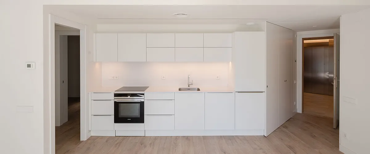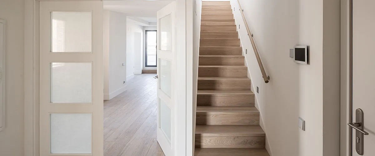 Als pisos, s’han instal·lat nous paviments de parquet que aporten calidesa i continuïtat visual. També s’han dissenyat i col·locat armaris a mida, optimitzant l’emmagatzematge i adaptant-se a les necessitats dels usuaris. Les portes interiors han estat renovades, amb un acabat net i funcional que contribueix a la sensació d’ordre i lluminositat.
