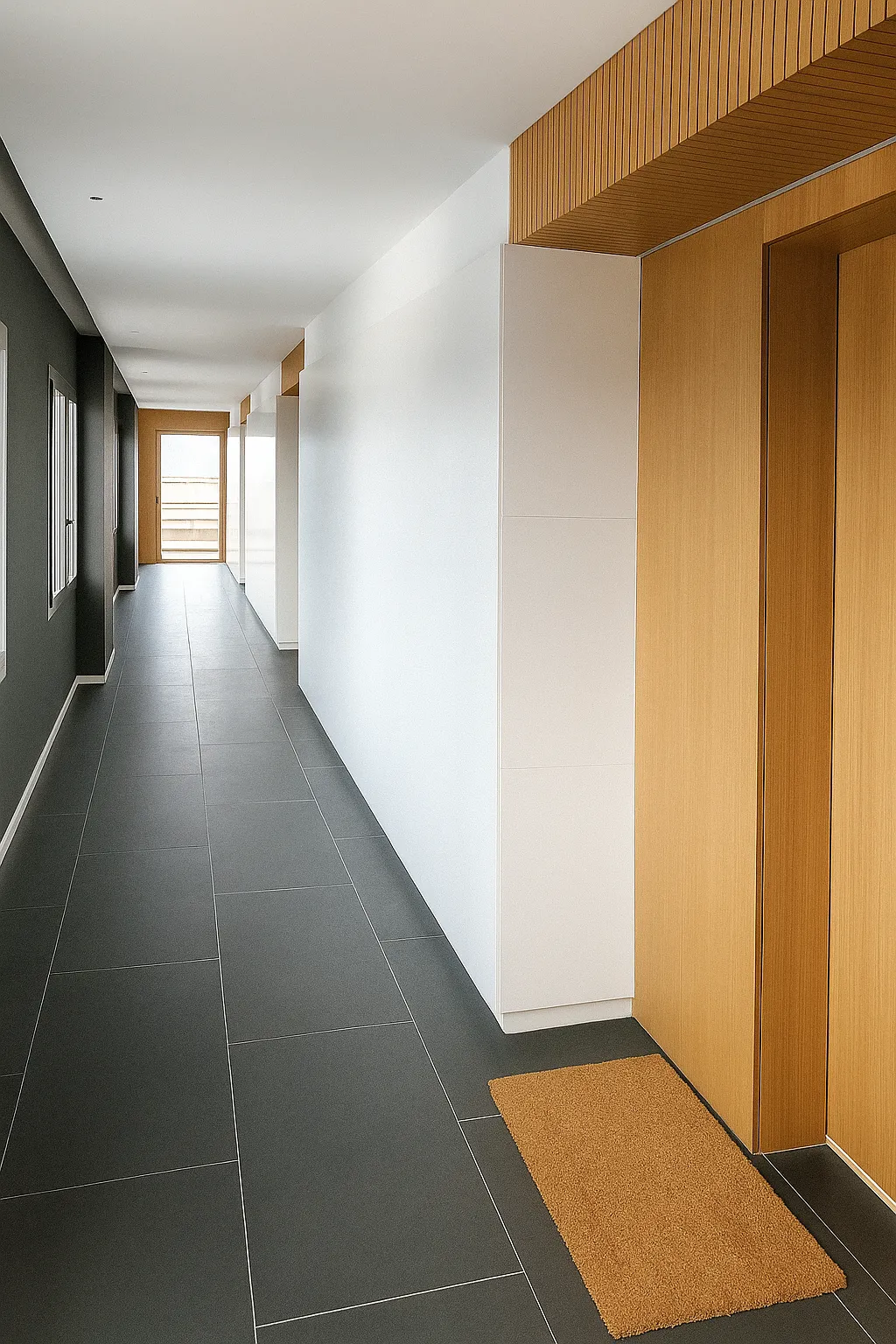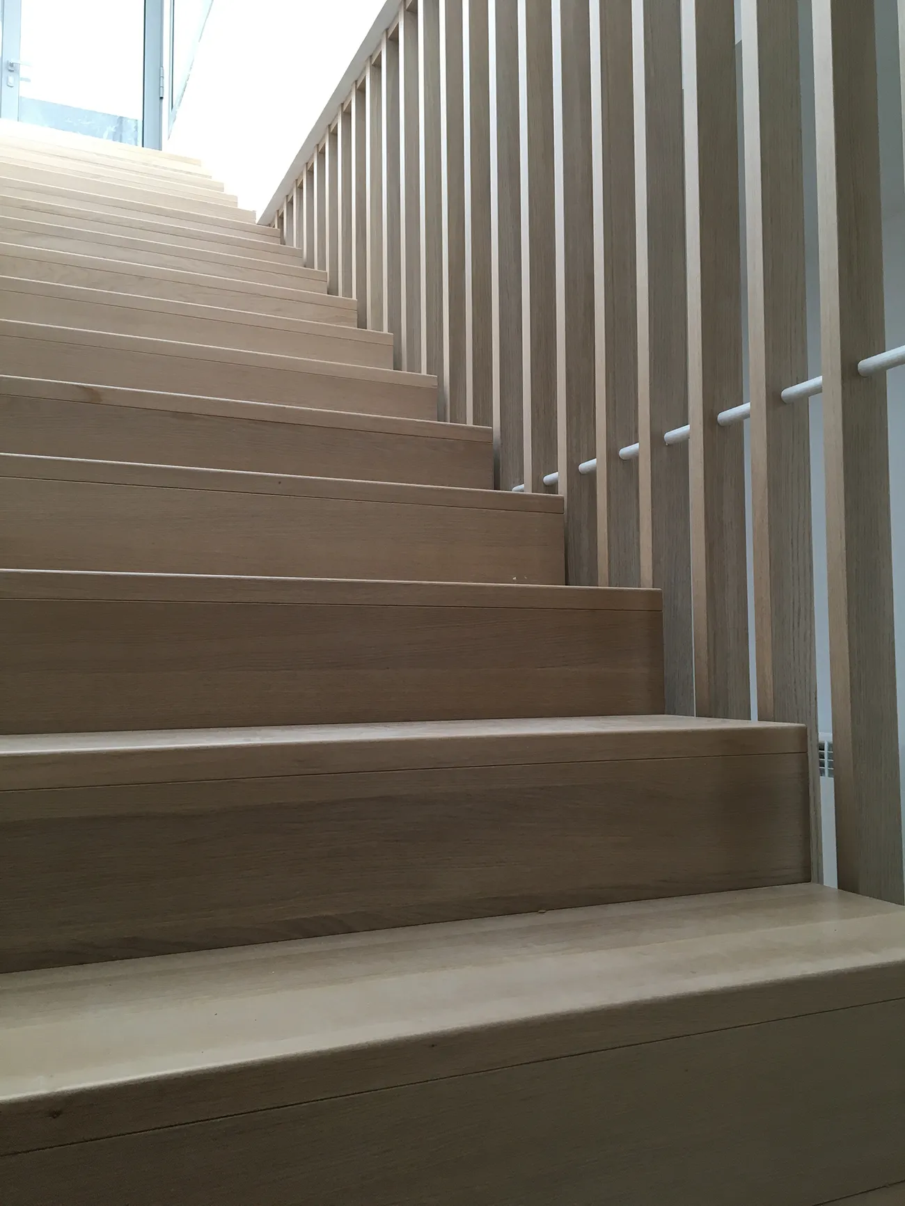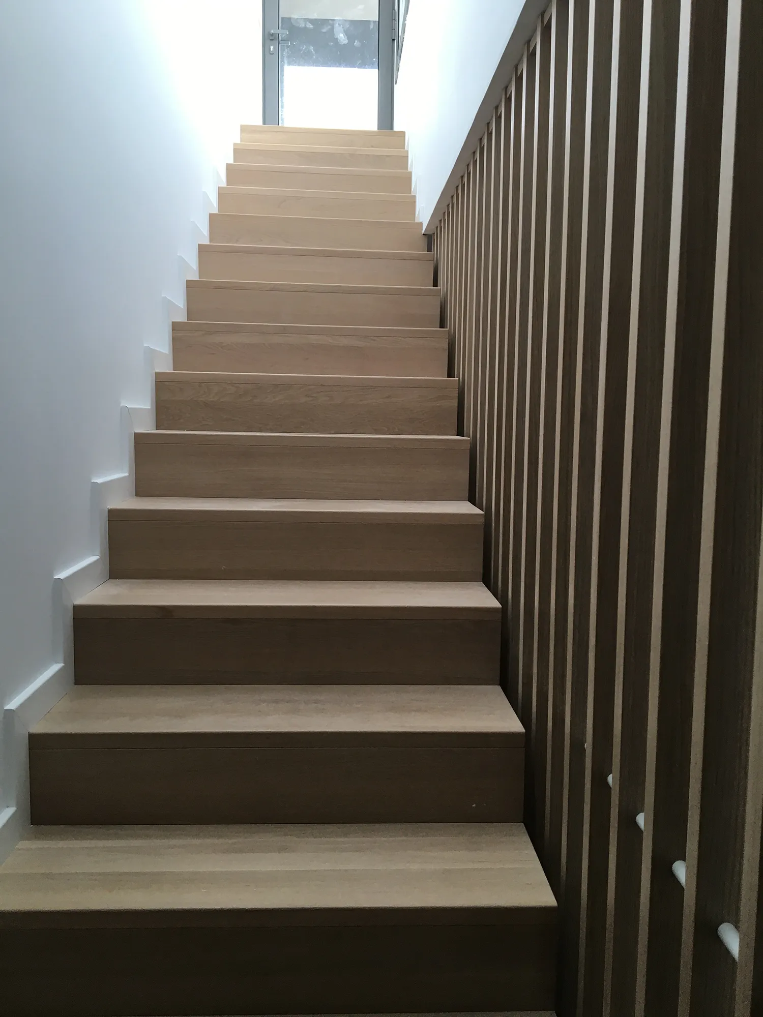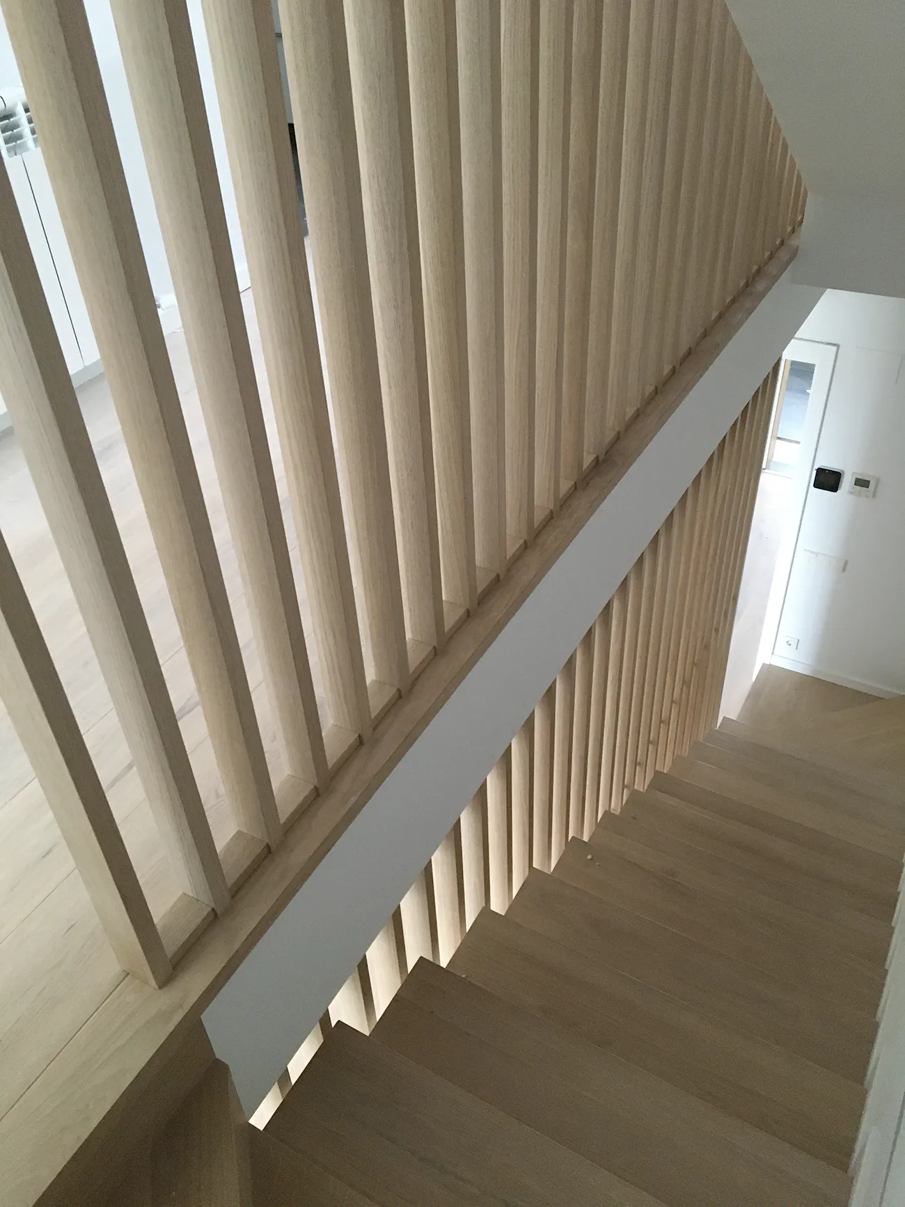 Hem treballat en la fusteria d’escales, així com en la fabricació i instal·lació de panells de revestiment que acompanyen el recorregut vertical de l’edifici, aportant calidesa i continuïtat visual.