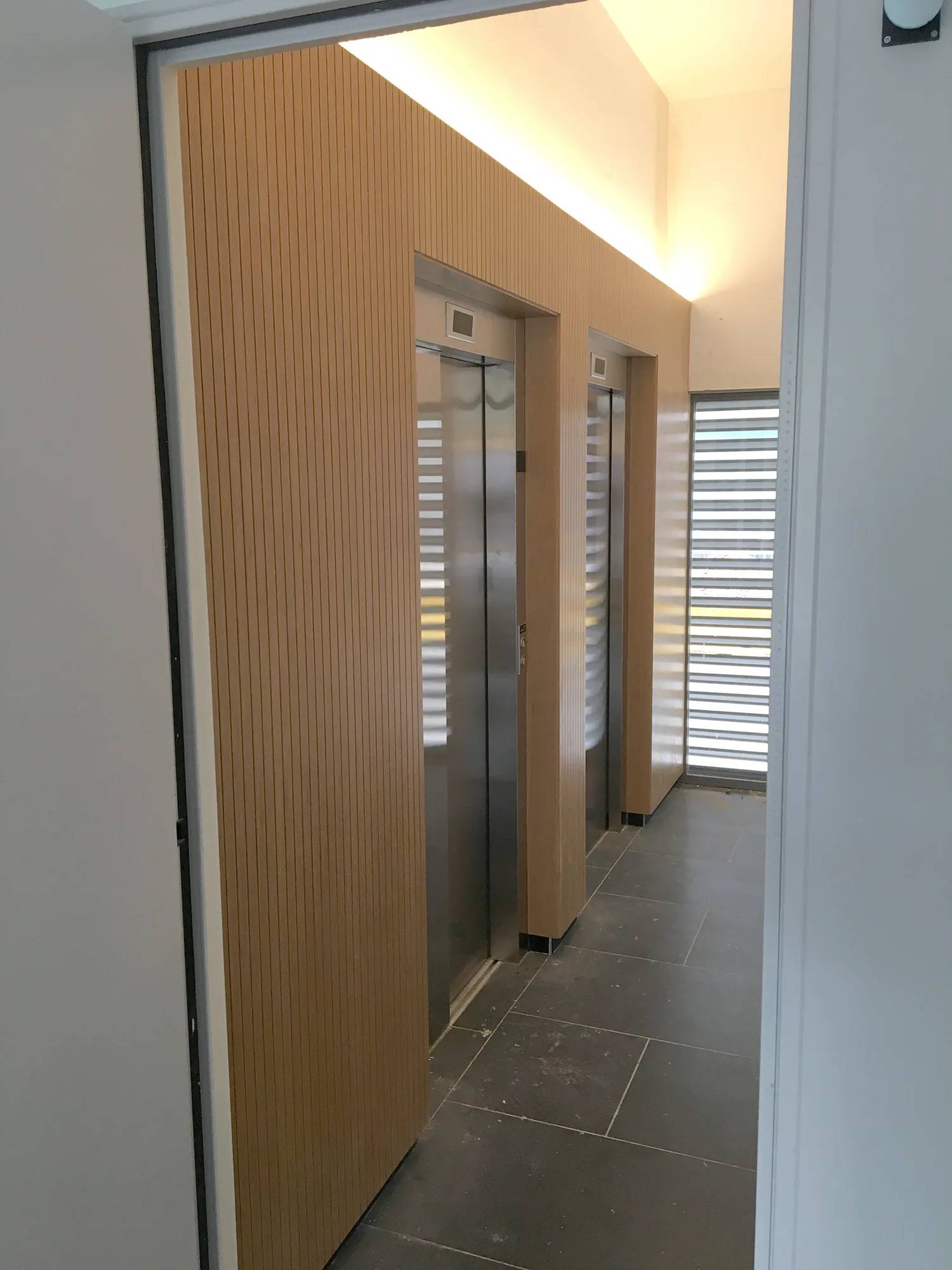 A l’entrada, hem revestit en fusta la paret on se situen les bústies, creant un espai d’acollida amb identitat pròpia. També hem revestit la paret on hi ha els ascensors, generant un ambient harmònic i contemporani.