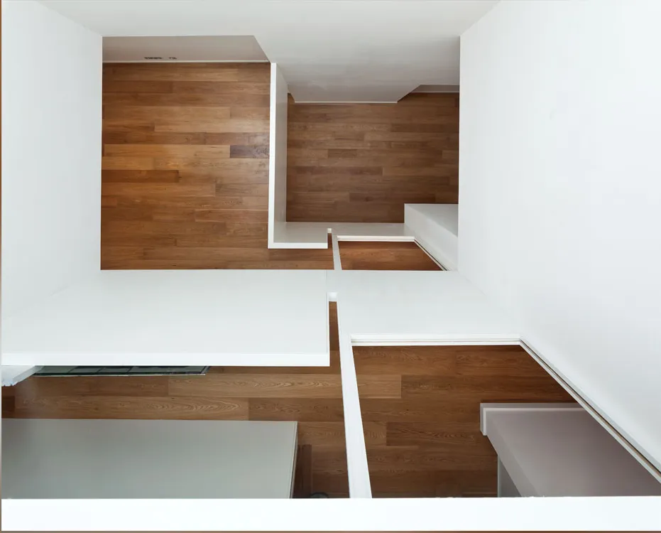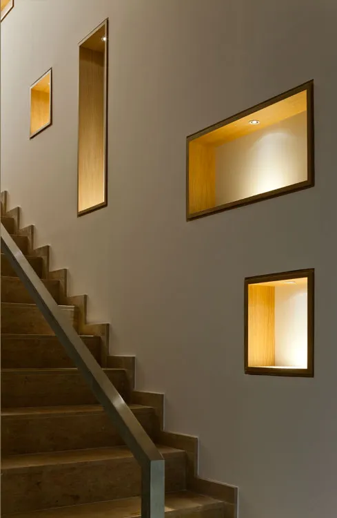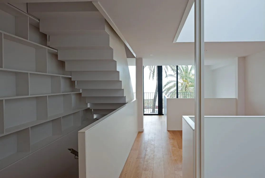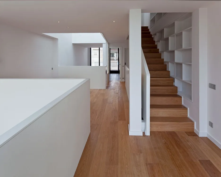 Hem treballat a l’escala i els espais comuns, aportant calidesa i continuïtat visual amb revestiments i detalls en fusta.